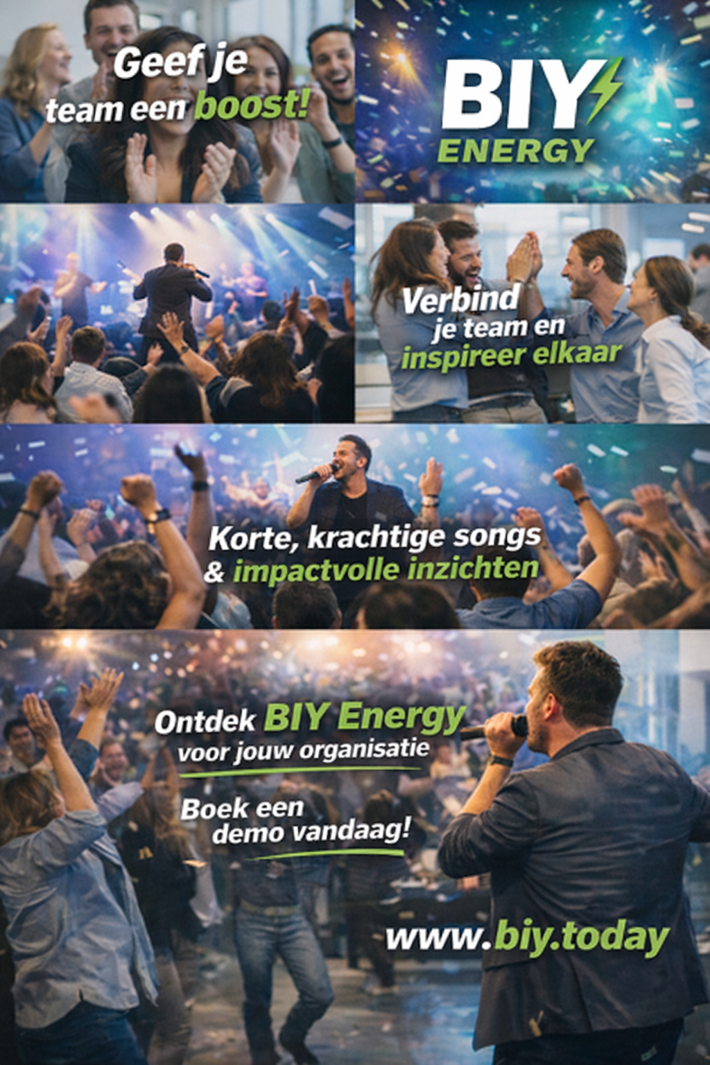 BIY Energy is de fysieke vertaling van wat jouw team nodig heeft op het juiste moment.In 30 minuten verbinden we jouw mensen via 4 originele songs rond universele thema's die elk personeelslid raken.